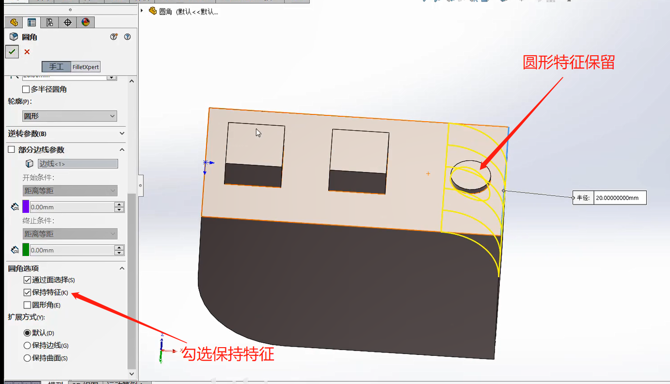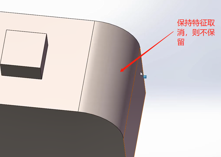 B. 保持特征:如果圆角特征过大,覆盖到一些其他特征,如拉伸凸台,可通过保持特征 确定拉伸特征是否保留: