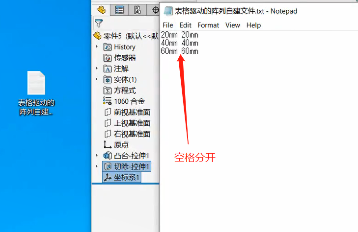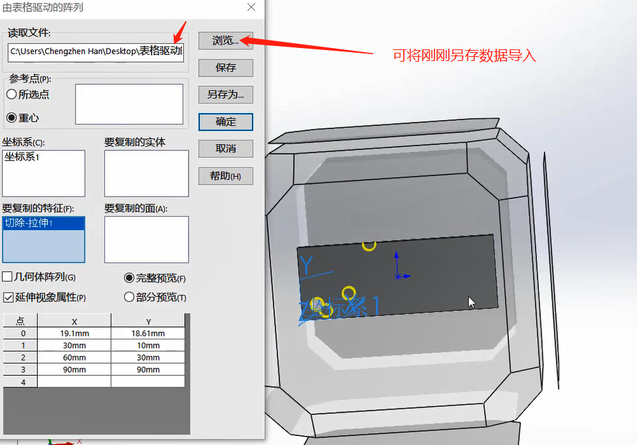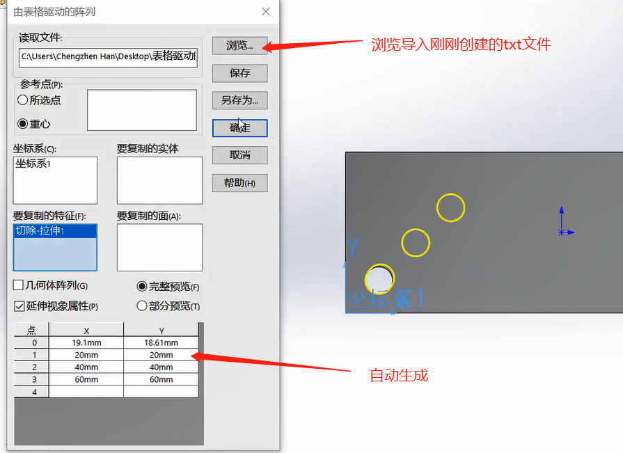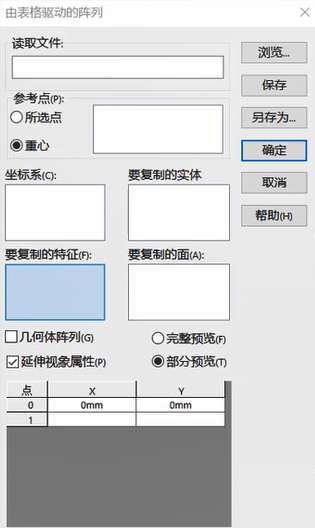 2.读取文件:输入带X-Y坐标的阵列表或文字文件,单击浏览,然后选择一阵列表(*.sldptab)文件或文字(*.txt)文件来输入现有的X-Y坐标。注意:用于由表格驱动的阵列的文本文件应只包含两个列:左列用于X坐标,右列用于 Y 坐标。两个列应由一分隔符分开,如空格、逗号或制表符。您可在同一文本文件中使用不同分隔符组合。不要在文本文件中包括任何其它信息,因为这可引发输入失败。