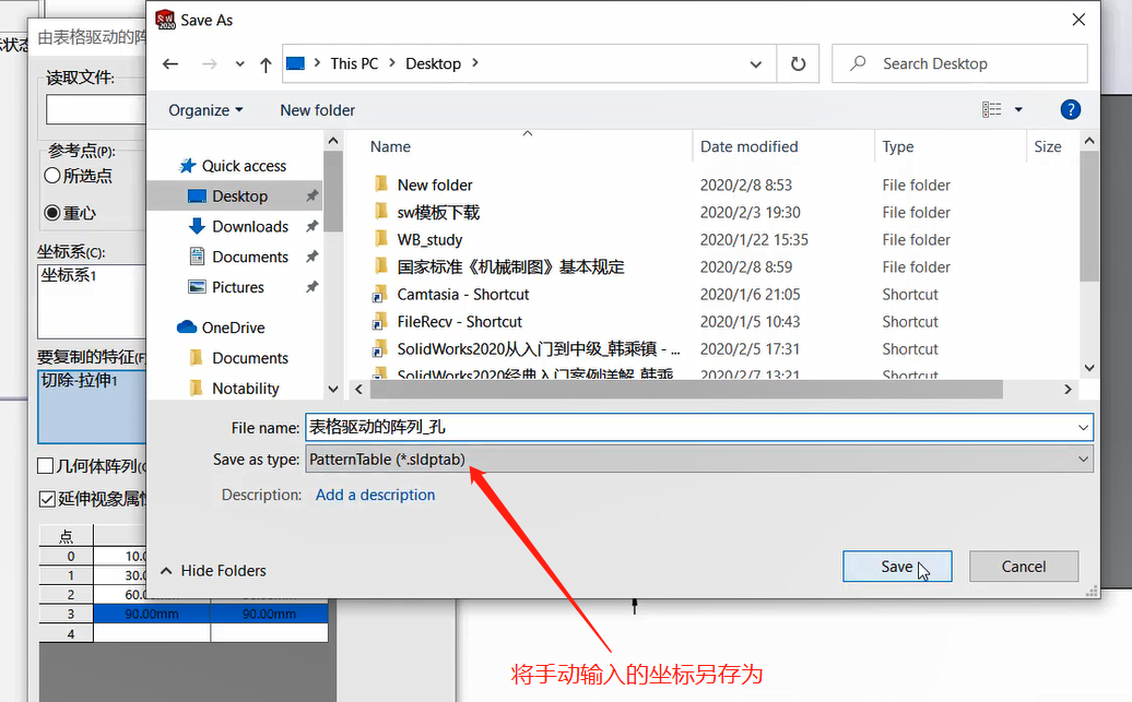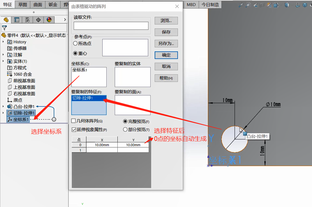 5.坐标系:设定用来生成表格阵列的坐标系,包括原点。从Feature Manager 设计树选择您所生成的坐标系;