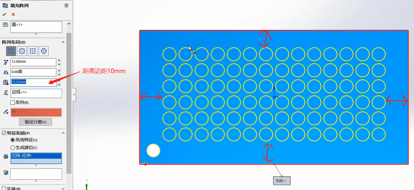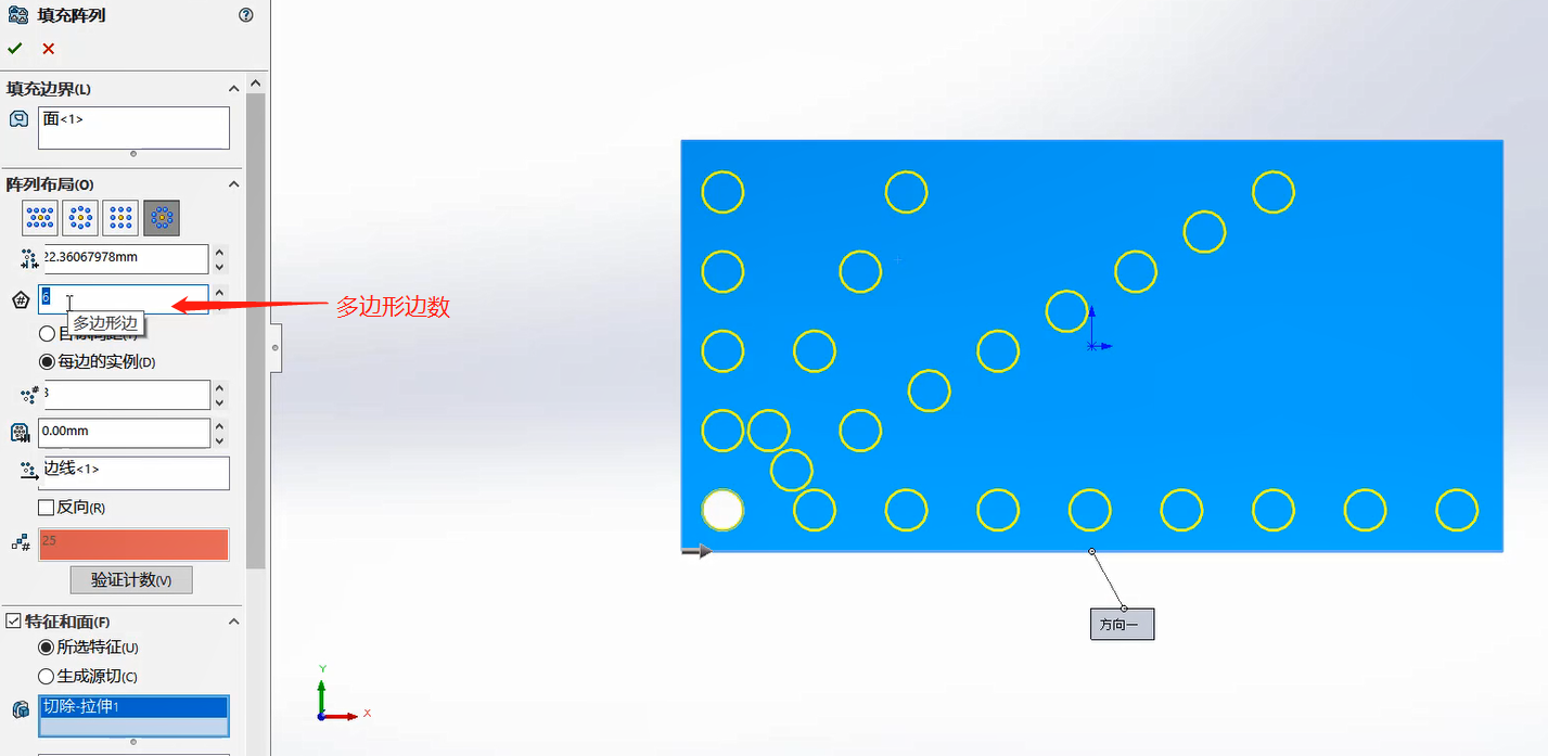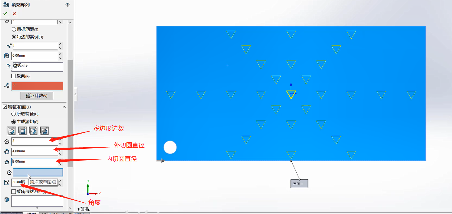 2.填充边界:定义要使用阵列填充的区域:选择草图、面上的平面曲线、面或共有平面的面:如果使用草图作为边界,可能需要选择阵列方向: