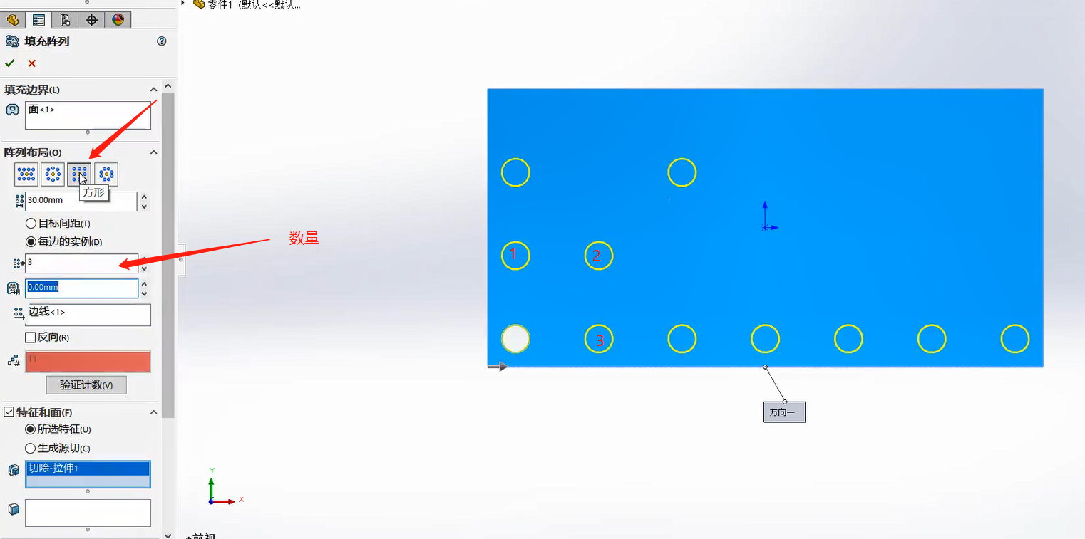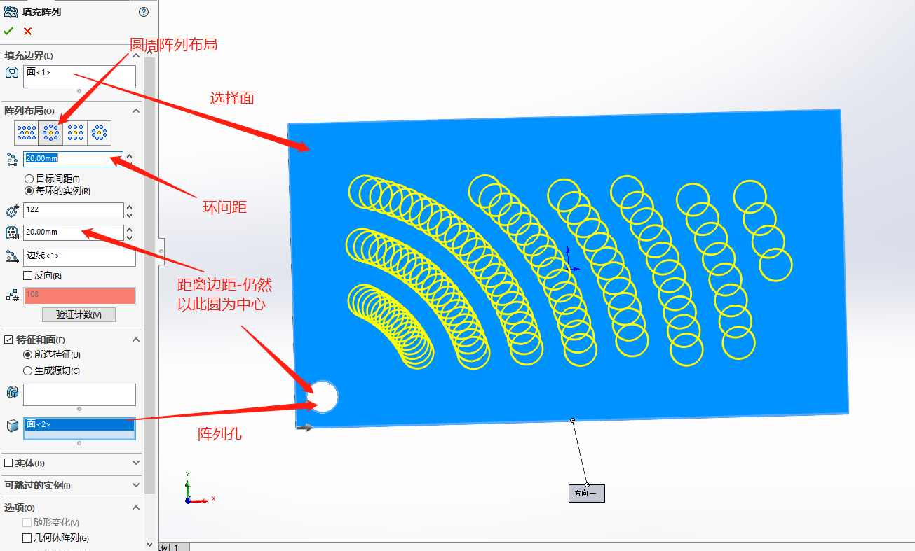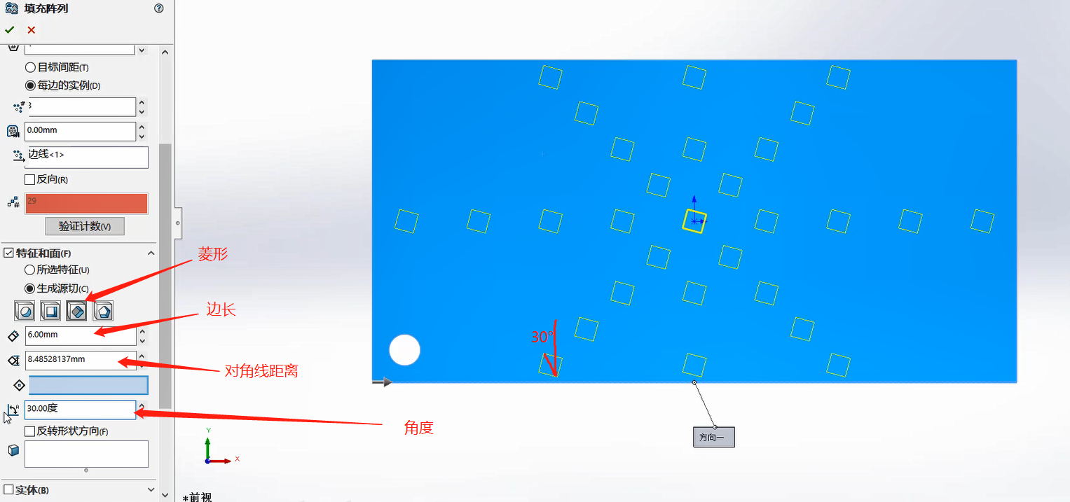 2.填充边界:定义要使用阵列填充的区域:选择草图、面上的平面曲线、面或共有平面的面:如果使用草图作为边界,可能需要选择阵列方向:
