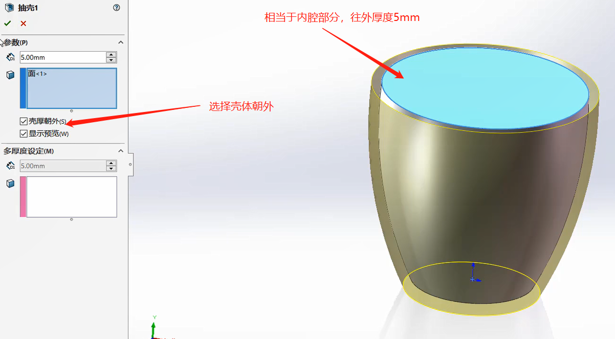 如果不选择面,实体则会被抽空,形成封闭的实体;抽壳类似于草图环境下的等距: