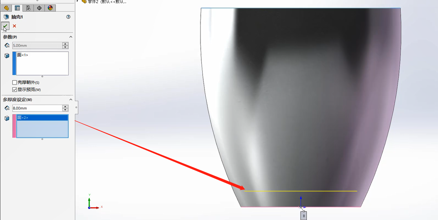 A.厚度:输入厚度的数值;此数值为抽壳后实体的壁厚: