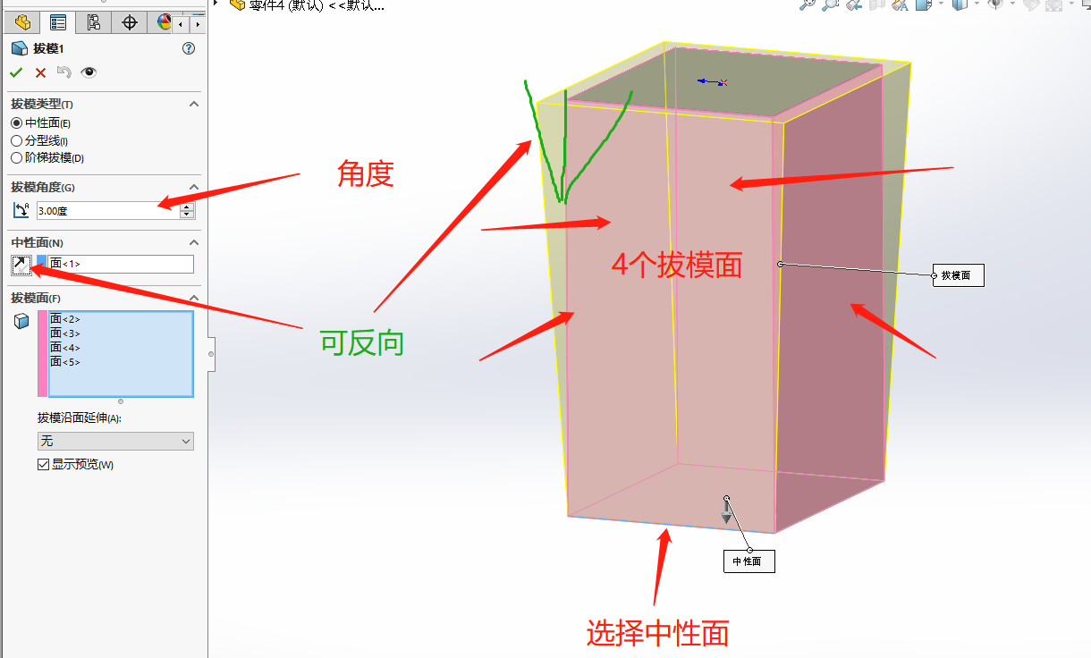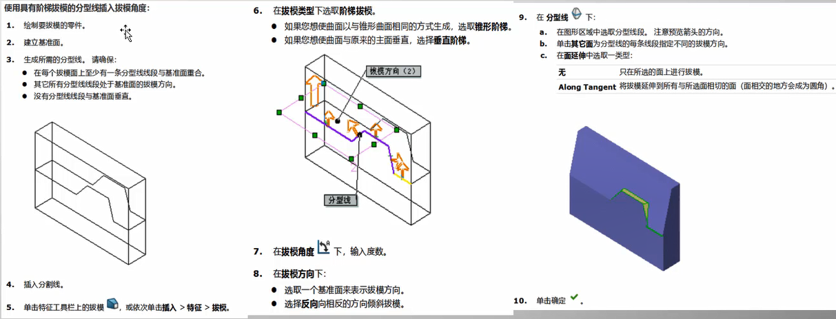 1.定义:通过拔模命令,将实体具有一定的倾斜角度,一般用于模具环境中;