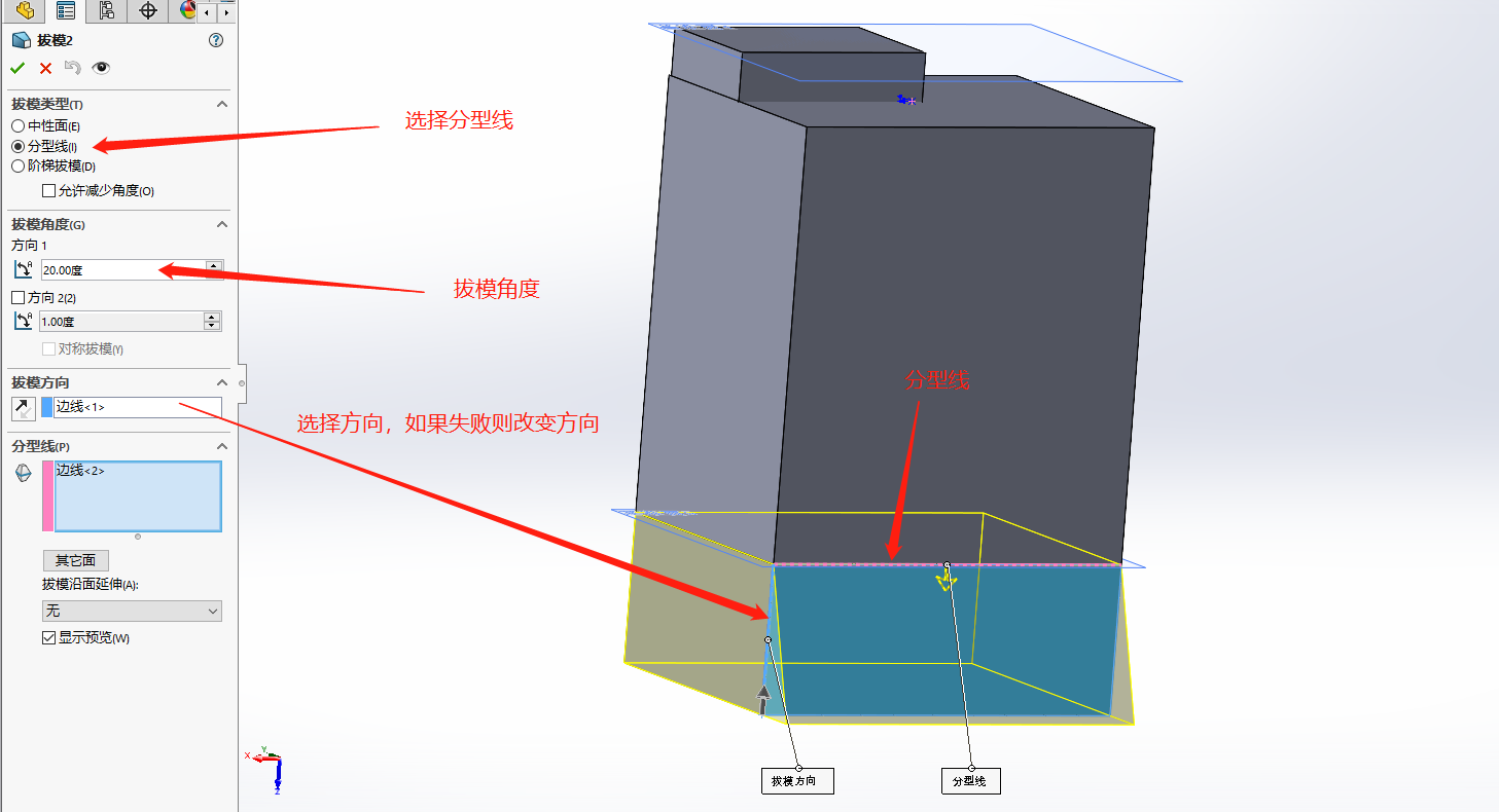 AlongTangent 将拔延伸到所有与所选面相切的面。(面相交的地方会成为圆角)。外部面包括您在基体拉伸上选取的任何面