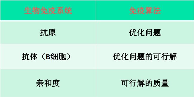 一般会抑制浓度过高的个体(抗体和抗体间亲和度大),保证个体的多样性。即会促进或者激励亲和度大(抗体和抗原间)、浓度低的抗体。 - 生物免疫系统与免疫算法概念的对应关系