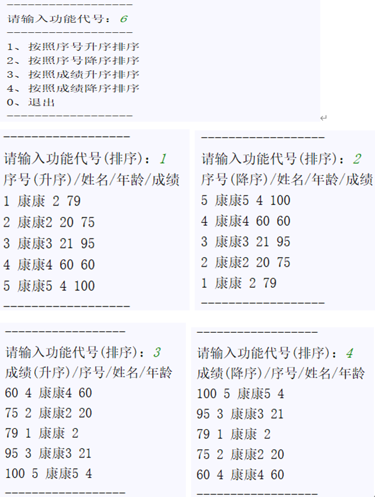 排序:由于前几个功能的测试,只剩下一组数据,故又添加了四组数据,如图1-7。然后我们进行排序,我设置了四种方式:按序号(升序)、按序号(降序)、按成绩(升序)、按成绩(降序),如图集1-8。