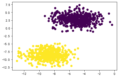 X,y = datasets.make_blobs(n_samples=1000, n_features=2, centers=2, cluster_std=1.5)