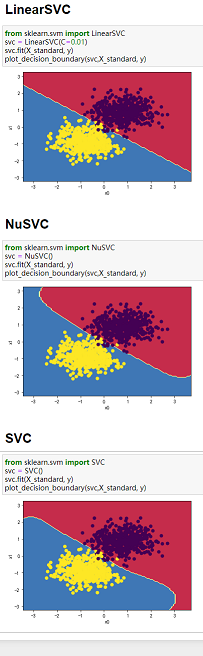 4、当数据分类界限明显且能用直线分割时,可以用LinearSVC;当数据类别分界线呈包围或者半包围状态时,用SVC最好。综上,SVC处理数据综合性最好。