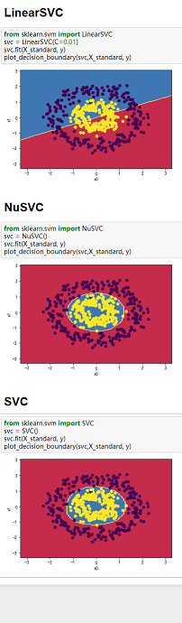 👉3、请同时对比,LinearSVC,NuSVC和SVC,三者在莺尾花数据集,make_blobs生成的数据集,还有makemoons生成的数据集,还有makecircles生成的数据集,对比差异。