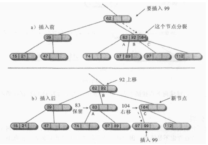查找是从上到下的,所以分裂也是从最上方的满节点开始。这也保证了要分裂的节点的父节点一定是不满的,否则应该先分裂父节点。