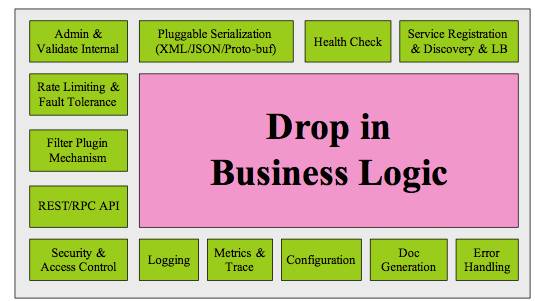 微服务化以后,为了让业务开发人员专注于业务逻辑实现,避免冗余和重复劳动,规范研发提升效率,必然要将一些公共关注点推到框架层面。服务框架(Fig 9)主要封装公共关注点逻辑,包括: