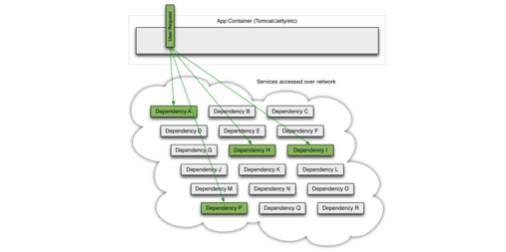当企业微服务化以后,服务之间会有错综复杂的依赖关系,例如,一个前端请求一般会依赖于多个后端服务,技术上称为1 -> N扇出(见图Fig 6)。在实际生产环境中,服务往往不是百分百可靠,服务可能会出错或者产生延迟,如果一个应用不能对其依赖的故障进行容错和隔离,那么该应用本身就处在被拖垮的风险中。在一个高流量的网站中,某个单一后端一旦发生延迟,可能在数秒内导致所有应用资源(线程,队列等)被耗尽,造成所谓的雪崩效应(Cascading Failure,见图 7),严重时可致整个网站瘫痪。