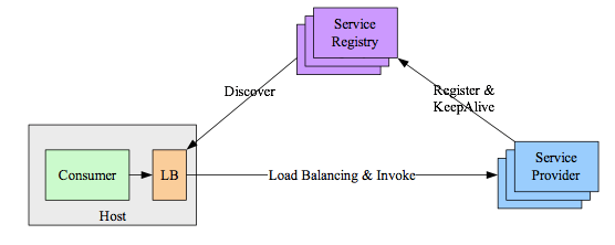 第三种是主机独立LB进程方案,该方案是针对第二种方案的不足而提出的一种折中方案,原理和第二种方案基本类似,不同之处是,他将LB和服务发现功能从进程内移出来,变成主机上的一个独立进程,主机上的一个或者多个服务要访问目标服务时,他们都通过同一主机上的独立LB进程做服务发现和负载均衡,见下图Fig 3。