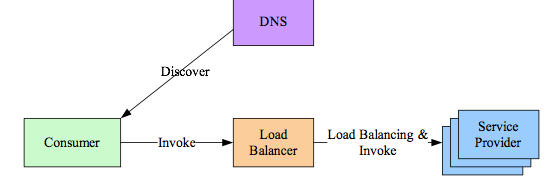 第一种是集中式LB方案,如下图1,在服务消费者和服务提供者之间有一个独立的LB,LB通常是专门的硬件设备如F5,或者基于软件如LVS,HAproxy等实现。LB上有所有服务的地址映射表,通常由运维配置注册,当服务消费方调用某个目标服务时,它向LB发起请求,由LB以某种策略(比如Round-Robin)做负载均衡后将请求转发到目标服务。LB一般具备健康检查能力,能自动摘除不健康的服务实例。服务消费方如何发现LB呢?通常的做法是通过DNS,运维人员为服务配置一个DNS域名,这个域名指向LB。