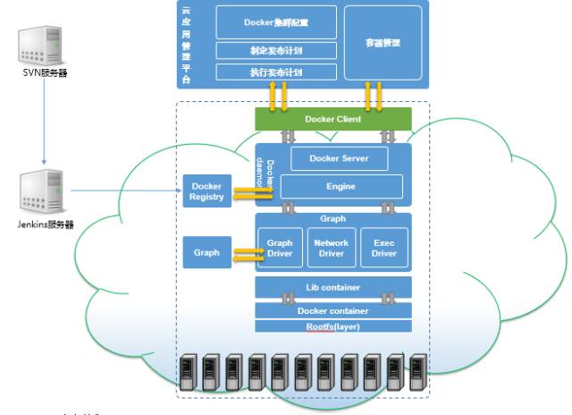 “云应用管理平台”围绕着Docker进行了大量的开发工作,制作了主机管理、容器管理、集群管理、版本计划管理、版本执行管理等等,其架构如下图: