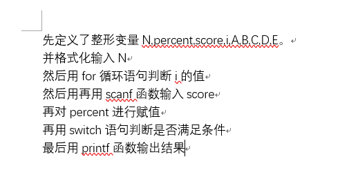 1.我的代码定义了N,percent,score,i,A,B,C,D,E。并且用了switch语句最后用printf输出