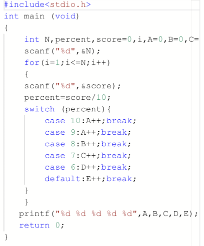 -数据表达:使用整形变量N,percent,score,i,A,B,C,D,E。分别表示N个学生,百分制,分数,i用于for循环。