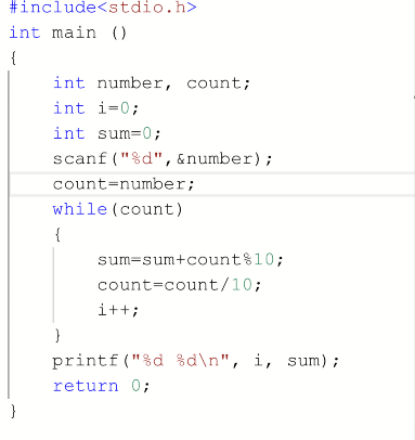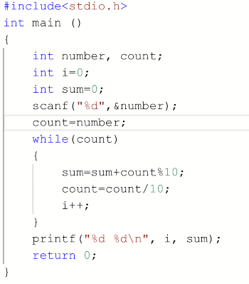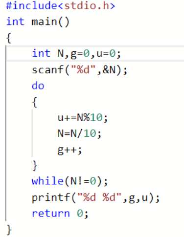 | 内容描述: 在一行中输出N的位数及其各位数字之和,中间用一个空格隔开。 | |