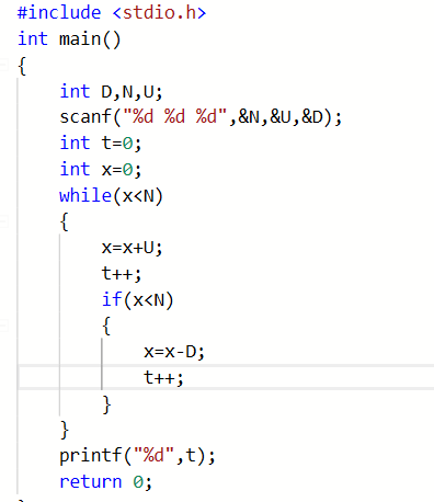 问题描述:一条蠕虫长1寸,在一口深为N寸的井的底部。已知蠕虫每1分钟可以向上爬U寸,但必须休息1分钟才能接着往上爬。在休息的过程中,蠕虫又下滑了D寸。就这样,上爬和下滑重复进行。请问,蠕虫需要多长时间才能爬出井?这里要求不足1分钟按1分钟计,并且假定只要在某次上爬过程中蠕虫的头部到达了井的顶部,那么蠕虫就完成任务了。初始时,蠕虫是趴在井底的(即高度为0)。