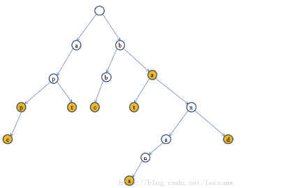 其中,黄色的节点代表从根节点通往该节点的路径上所经过的节点的字符构成的一个字符串出现在原来的输入文本中,如以d为例,路径上的字符为:b-a-n-d,对应输入的字符串集合中的”band”。TrieTree可以很方便的扩展,当来了新的字符串时,只要把新的字符串按照原本的规则插入到原来的树中,便可以得到新的树。如需要加入新的单词”bat”,那么树的结构只需简单的拓展成如下的形式: