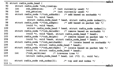 95-110 从rnh_addaddr到rnh_walktree是七个函数指针,它们所指向的函数将被调用以完成对树的操作;