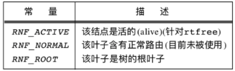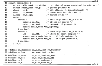 48-49 对于叶子而言,rn_key指向插口地址结构,rn_mask指向保存掩码的插口地址结构.如果rn_mask为空,则其掩码为隐含的全1值(即,该路由指向某个主机而不是某个网络)