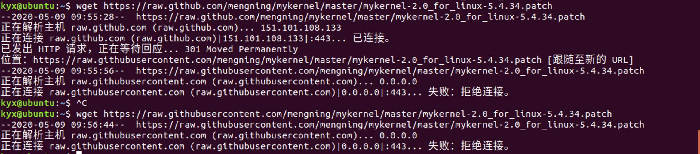 2.1.1 wget https://raw.github.com/mengning/mykernel/master/mykernel-2.0_for_linux-5.4.34.patch
