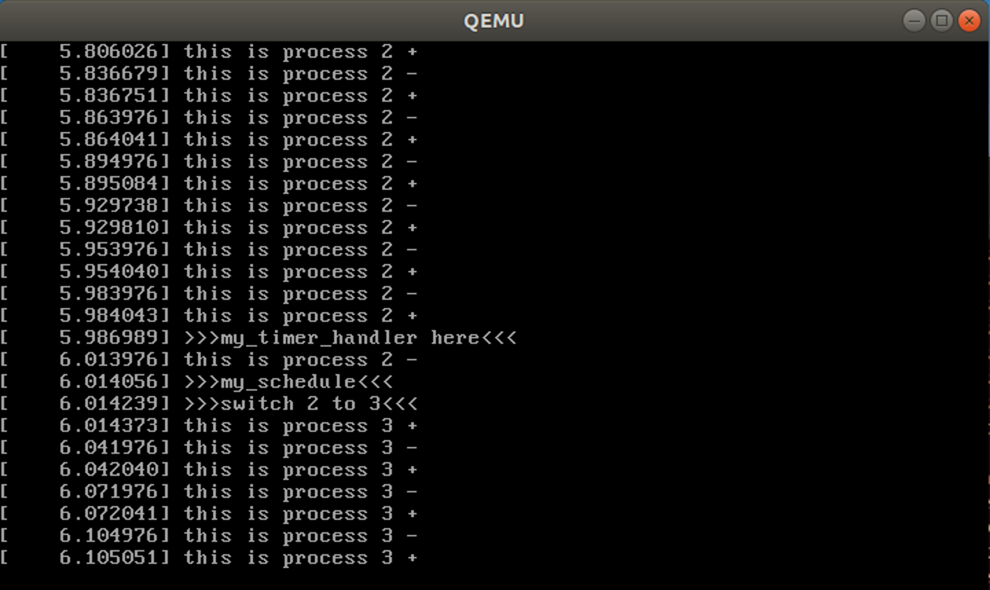 1 /* 2 时间片轮转调度 3 */ 4 5 #include "mypcb.h" 6 7 8 tPCB task[MAX_TASK_NUM]; 9 tPCB * my_current_task = NULL; 10 volatile int my_need_sched = 0; 11 12 13 void my_process(void); 14 15 16 void __init my_start_kernel(void) 17 { 18 int pid = 0; 19 int i; 20 /* Initialize process 0*/ 21 task[pid].pid = pid; 22 task[pid].state = 0;/* -1 unrunnable, 0 runnable, >0 stopped */ 23 task[pid].task_entry = task[pid].thread.ip = (unsigned long)my_process; 24 task[pid].thread.sp = (unsigned long)&task[pid].stack[KERNEL_STACK_SIZE-1]; 25 task[pid].next = &task[pid]; 26 /*fork more process */ 27 for(i=1;i<MAX_TASK_NUM;i++) 28 { 29 memcpy(&task[i],&task[0],sizeof(tPCB)); 30 task[i].pid = i; 31 task[i].state = -1; 32 task[i].thread.sp = (unsigned long)&task[i].stack[KERNEL_STACK_SIZE-1]; 33 task[i].next = task[i-1].next; 34 task[i-1].next = &task[i]; 35 } 36 /* start process 0 by task[0] */ 37 pid = 0; 38 my_current_task = &task[pid]; 39 asm volatile( 40 "movq %1,%%rsp\n\t" /* set task[pid].thread.sp to rsp */ 41 "pushq %1\n\t" /* push rbp */ 42 "pushq %0\n\t" /* push task[pid].thread.ip */ 43 "ret\n\t" /* pop task[pid].thread.ip to rip */ 44 : 45 : "c" (task[pid].thread.ip),"d" (task[pid].thread.sp) /* input c or d mean %ecx/%edx*/ 46 ); 47 } 48 49 void my_process(void) 50 { 51 int i = 0; 52 while(1) 53 { 54 i++; 55 if(i%10000000 == 0) 56 { 57 printk(KERN_NOTICE "this is process %d -\n",my_current_task->pid); 58 if(my_need_sched == 1) 59 { 60 my_need_sched = 0; 61 my_schedule(); 62 } 63 printk(KERN_NOTICE "this is process %d +\n",my_current_task->pid); 64 } 65 } 66 }