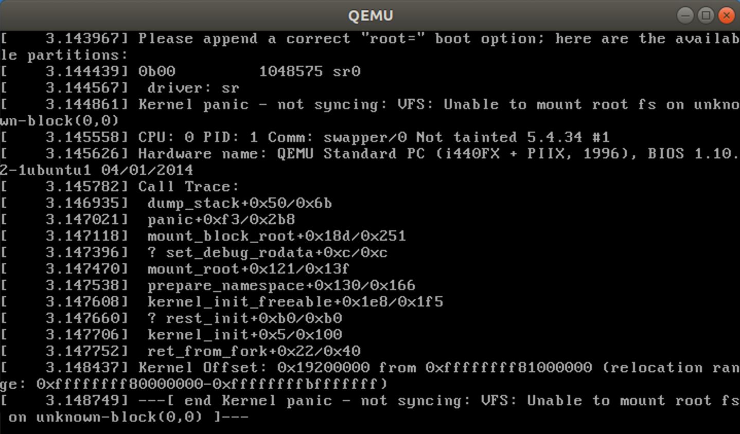 1 qemu-system-x86_64 -kernel linux-5.4.34/arch/x86/boot/bzImage -initrd rootfs.cpio.gz -S -s -nographic -append "console=ttyS0"
