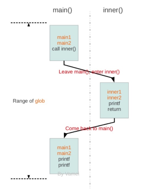 main()函数中调用了inner()函数。inner()中调用一次printf()以输出。最后,在main()中进行了两次printf()。