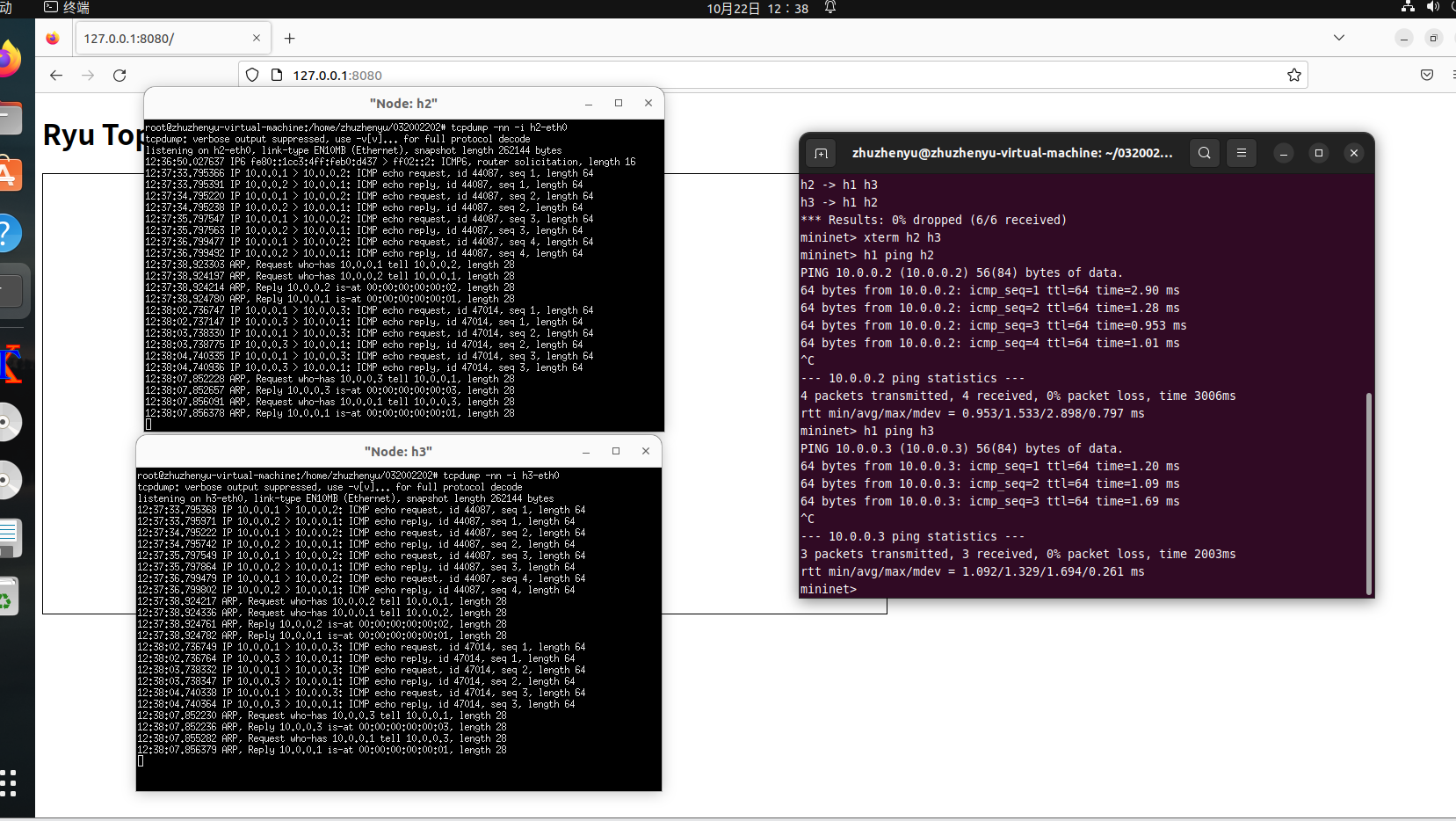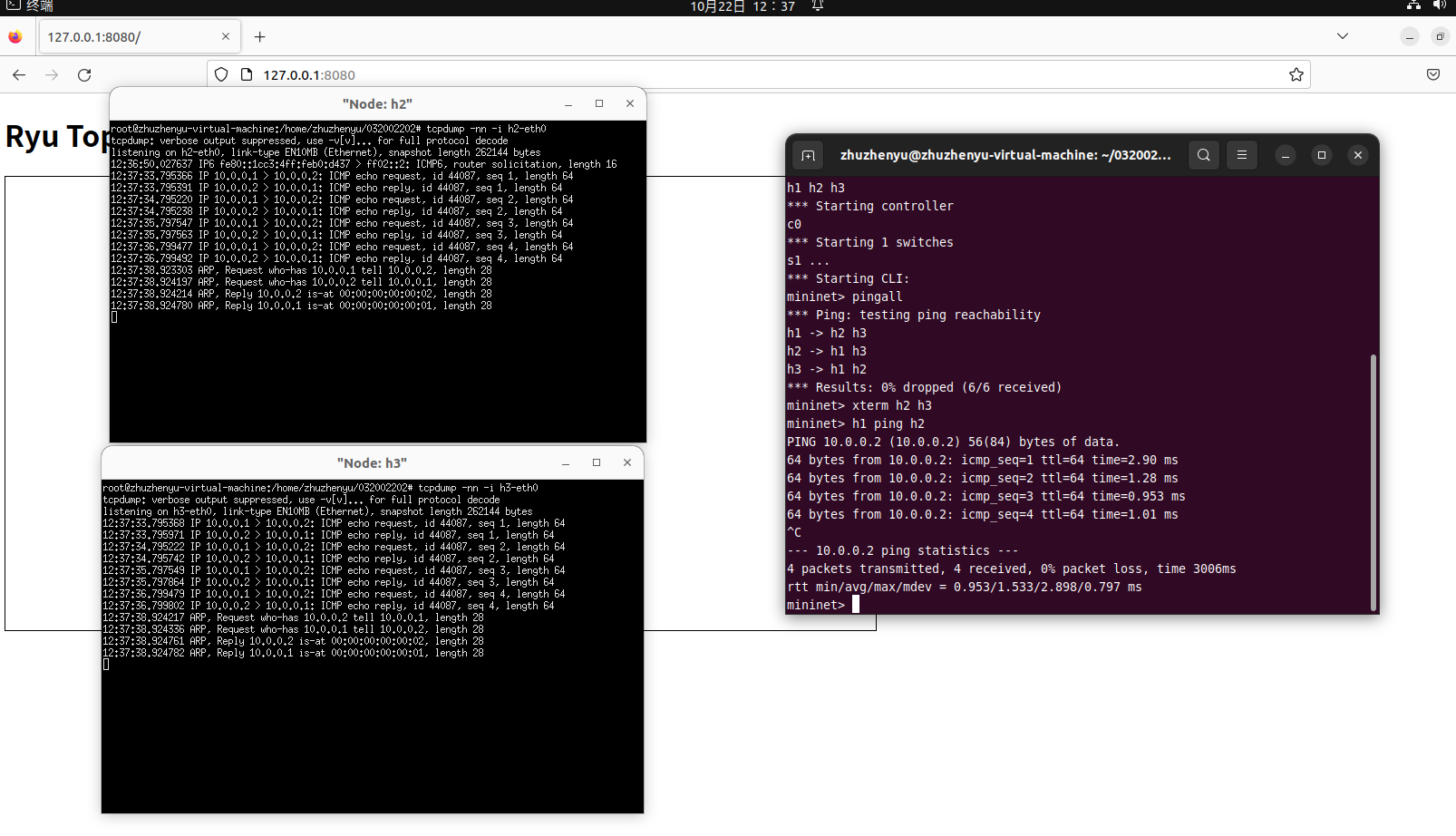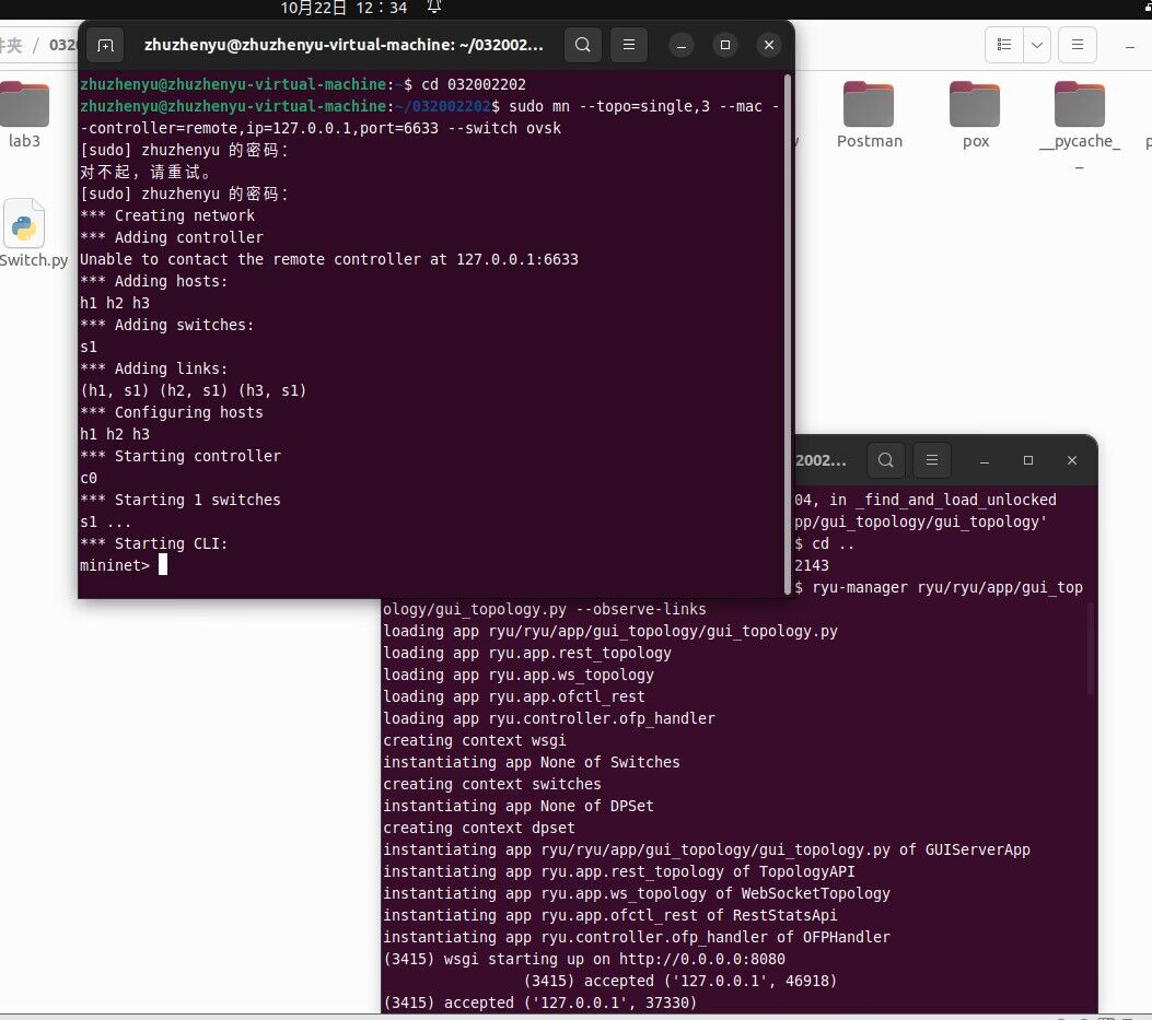 本次实验大部分时间都花在解决启动RYU问题上面。虽然后面也没有解决问题