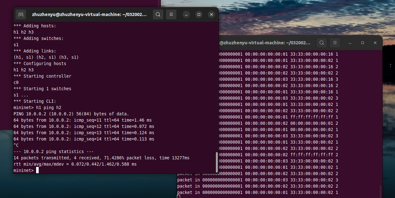 pox的Hub模块可以在运行时查看流表,而ryu的L2Switch模块无法在运行时查看到流表。不过他们也有相同点:都是依靠洪泛转发。