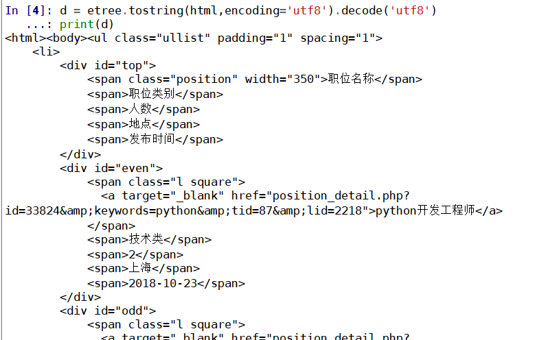 text = \ """ <ul class="ullist" padding="1" spacing="1"> <li> <div id="top"> <span class="position" width="350">职位名称</span> <span>职位类别</span> <span>人数</span> <span>地点</span> <span>发布时间</span> </div> <div id="even"> <span class="l square"> <a target="_blank" href="position_detail.php?id=33824&keywords=python&tid=87&lid=2218">python开发工程师</a> </span> <span>技术类</span> <span>2</span> <span>上海</span> <span>2018-10-23</span> </div> <div id="odd"> <span class="l square"> <a target="_blank" href="position_detail.php?id=29938&keywords=python&tid=87&lid=2218">python后端</a> </span> <span>技术类</span> <span>2</span> <span>上海</span> <span>2018-10-23</span> </div> <div id="even"> <span class="l square"> <a target="_blank" href="position_detail.php?id=31236&keywords=python&tid=87&lid=2218">高级Python开发工程师</a> </span> <span>技术类</span> <span>2</span> <span>上海</span> <span>2018-10-23</span> </div> <div id="odd"> <span class="l square"> <a target="_blank" href="position_detail.php?id=31235&keywords=python&tid=87&lid=2218">python架构师</a> </span> <span>技术类</span> <span>1</span> <span>上海</span> <span>2018-10-23</span> </div> <div id="even"> <span class="l square"> <a target="_blank" href="position_detail.php?id=34531&keywords=python&tid=87&lid=2218">Python数据开发工程师</a> </span> <span>技术类</span> <span>1</span> <span>上海</span> <span>2018-10-23</span> </div> <div id="odd"> <span class="l square"> <a target="_blank" href="position_detail.php?id=34532&keywords=python&tid=87&lid=2218">高级图像算法研发工程师</a> </span> <span>技术类</span> <span>1</span> <span>上海</span> <span>2018-10-23</span> </div> <div id="even"> <span class="l square"> <a target="_blank" href="position_detail.php?id=31648&keywords=python&tid=87&lid=2218">高级AI开发工程师</a> </span> <span>技术类</span> <span>4</span> <span>上海</span> <span>2018-10-23</span> </div> <div id="odd"> <span class="l square"> <a target="_blank" href="position_detail.php?id=32218&keywords=python&tid=87&lid=2218">后台开发工程师</a> </span> <span>技术类</span> <span>1</span> <span>上海</span> <span>2018-10-23</span> </div> <div id="even"> <span class="l square"> <a target="_blank" href="position_detail.php?id=32217&keywords=python&tid=87&lid=2218">Python开发(自动化运维方向)</a> </span> <span>技术类</span> <span>1</span> <span>上海</span> <span>2018-10-23</span> </div> <div id="odd"> <span class="l square"> <a target="_blank" href="position_detail.php?id=34511&keywords=python&tid=87&lid=2218">Python数据挖掘讲师 </a> </span> <span>技术类</span> <span>1</span> <span>上海</span> <span>2018-10-23</span> </div> </li> </ul> """