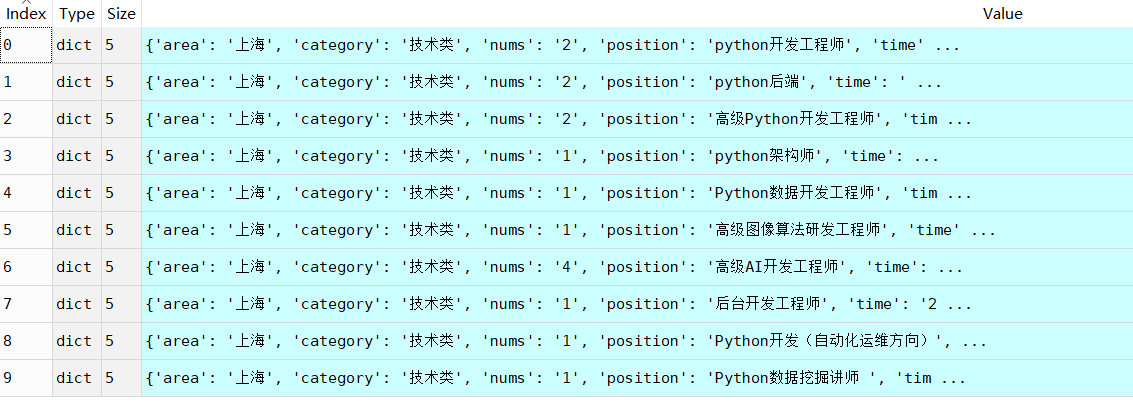 #获取所有的职位信息 divs = soup.find_all('div')[1:] #print(divs) works=[] for div in divs: #获取职位信息 a = div.find_all('a')[0] position = a.string #print(position) #职位信息 category = div.find_all('span')[1].string #print(position,category) #获取人数 nums = div.find_all('span')[2].string #获取地区 area = div.find_all('span')[3].string #获取时间 time = div.find_all('span')[4].string #print(position,category,nums,area,time) positions={ 'position':position, 'category':category, 'nums':nums, 'area':area, 'time':time } works.append(positions) print(works)