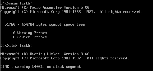 - 给出使用masm、link对程序汇编链接过程截图,以及,运行可执行程序task6.exe的运行结果截图
