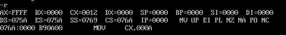 先使用f命令,把00220H ~ 0022fH区间的16个字节内存单元值全部修改为0。并使用d命令查看确认。 然后,使用a命令、r命令、t命令写入汇编指令并单步调试。