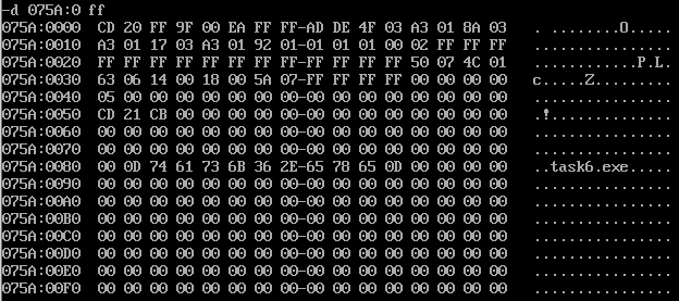 - 给出在debug中查看task6.exe的程序段前缀PSP的截图