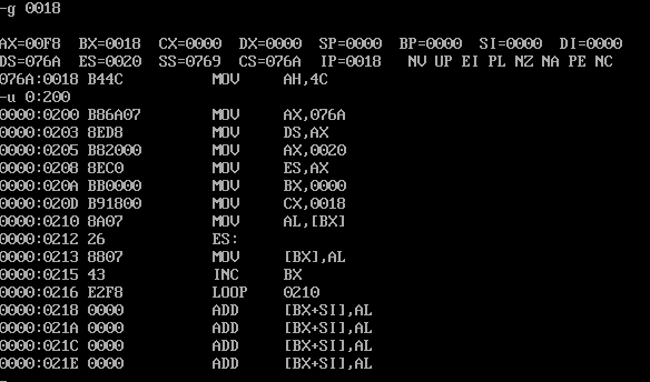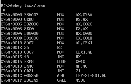 - 在debug中调试,使用g命令将程序执行到 loop s 之后、 mov ax, 4c00h 之前,然后,使用u命令 对0:200h开始的内存单元反汇编,确认是否把task7.asm中line3-line12