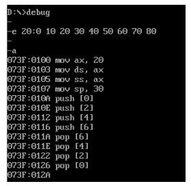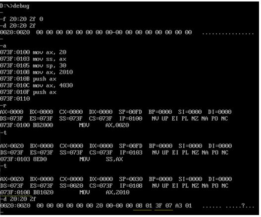 - 问题 2)根据汇编指令,前三条指令执行后,00220H ~ 0022fH被设置为栈空间。并且,初始时,已通过f命令将初始栈空间全部填充为0。观察单步调