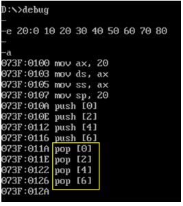 4)如果把最后四条指令改成截图中的顺序, pop [6] 指令执行结束后,使用d命令 d 20:0 7 查看此时数据空间内的数据是否有变化。给出实验截图。