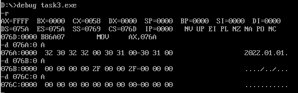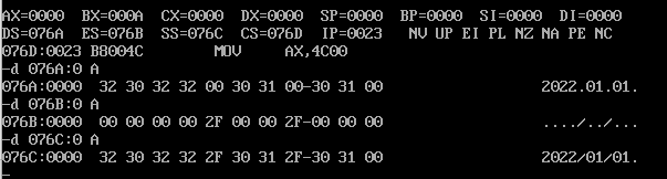 1 assume cs:code 2 data1 segment 3 db 50, 48, 50, 50, 0, 48, 49, 0, 48, 49 ; ten numbers 4 data1 ends 5 data2 segment 6 db 0, 0, 0, 0, 47, 0, 0, 47, 0, 0 ; ten numbers 7 data2 ends 8 data3 segment 9 db 16 dup(0) 10 data3 ends 11 code segment 12 start: 13 ; ××× 14 mov ah, 4ch 15 int 21h 16 code ends 17 end start