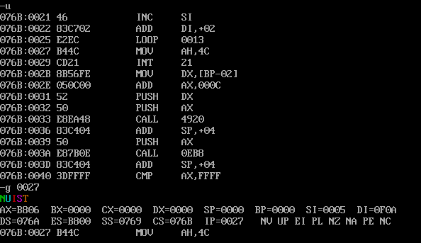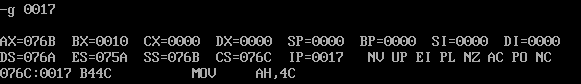 ① 在debug中将执行到line17结束、line19之前,记录此时:寄存器(DS) = _076A_, 寄存器(SS) = _076B_, 寄存器(CS) = _076C_。
