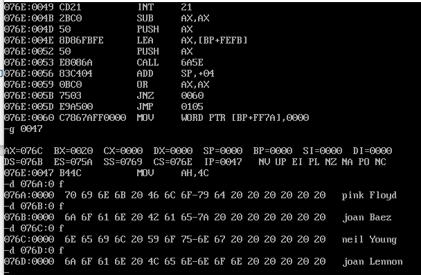 1 assume cs:code, ds:data 2 3 data segment 4 db 'Pink Floyd ' 5 db 'JOAN Baez ' 6 db 'NEIL Young ' 7 db 'Joan Lennon ' 8 data ends 9 10 code segment 11 start: 12 mov ax,data 13 mov ds,ax 14 mov cx,2 15 mov bx,0 16 s0: mov al,[bx] 17 add al,32 18 mov [bx],al 19 add bx,48 20 loop s0 21 mov ax,data 22 add ax,1 23 mov ds,ax 24 mov cx,2 25 mov bx,0 26 s: mov al,[bx] 27 add al,32 28 mov [bx],al 29 mov al,[bx+1] 30 add al,32 31 mov [bx+1],al 32 mov al,[bx+2] 33 add al,32 34 mov [bx+2],al 35 mov al,[bx+3] 36 add al,32 37 mov [bx+3],al 38 add bx,16 39 loop s 40 41 mov ah, 4ch 42 int 21h 43 code ends 44 end start
