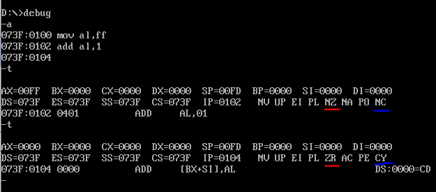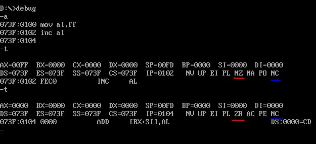 执行mov al,ff al中值不为0,ZF标记NZ(0),NC标记NC(0),