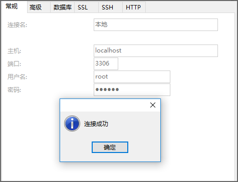 如上图填写好相应的输入栏,可以点击"连接测试",出现如下图则表示可以连接成功,选择“确定”即可连接 MySQL: