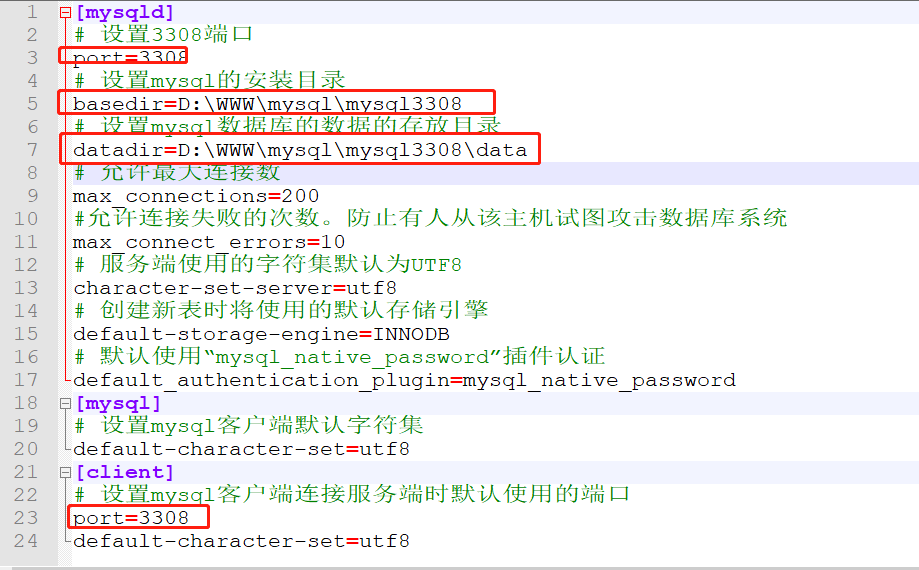 my.ini,放置在根目录,内容如下[mysqld] # 设置3306端口 port=3306 # 设置mysql的安装目录 basedir=G:\WWW\mysql # 设置mysql数据库的数据的存放目录 datadir=G:\WWW\mysql\data # 允许最大连接数 max_connections=200 #允许连接失败的次数。防止有人从该主机试图攻击数据库系统 max_connect_errors=10 # 服务端使用的字符集默认为UTF8 character-set-server=utf8 # 创建新表时将使用的默认存储引擎 default-storage-engine=INNODB # 默认使用“mysql_native_password”插件认证 default_authentication_plugin=mysql_native_password [mysql] # 设置mysql客户端默认字符集 default-character-set=utf8 [client] # 设置mysql客户端连接服务端时默认使用的端口 port=3306 default-character-set=utf8