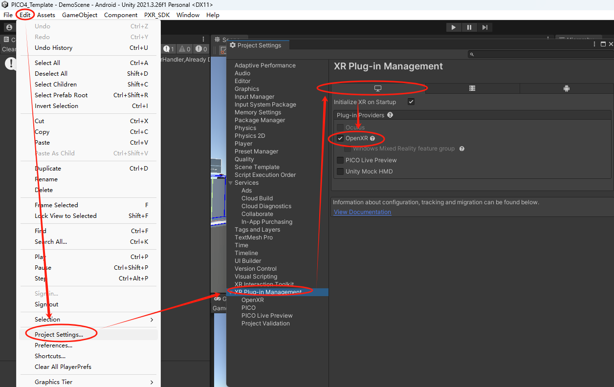 最后,在勾选 Edit - Project Setting - XR Plug-in Management - PC(图标) - OpenXR
