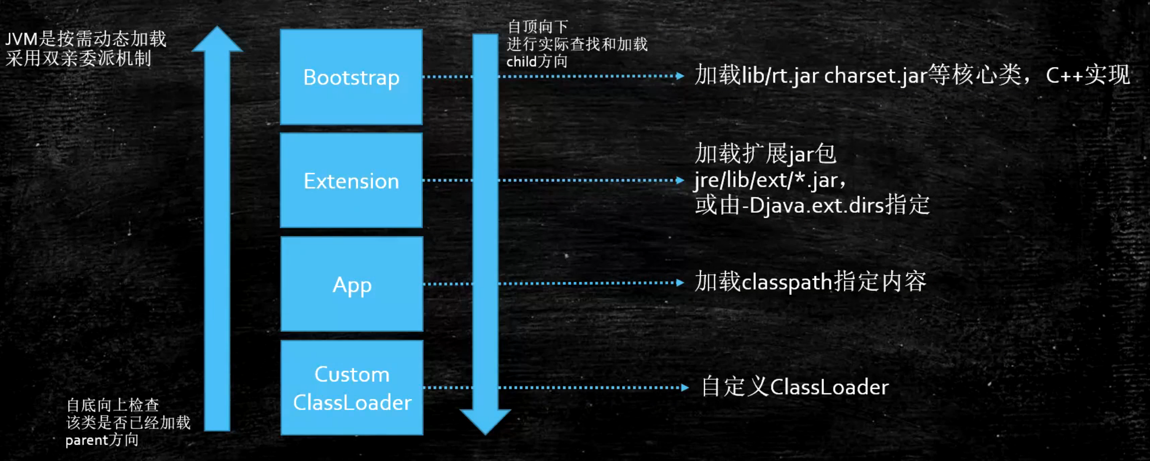 从逻辑上讲,类加载顺序是 自定义类加载器(cutomClassLoader)有没有加载过该类,然后找父加载器,顺序是app - Extension - Bootstrap,如果都没有加载过,那么又反方向查找,看谁能加载就加载。