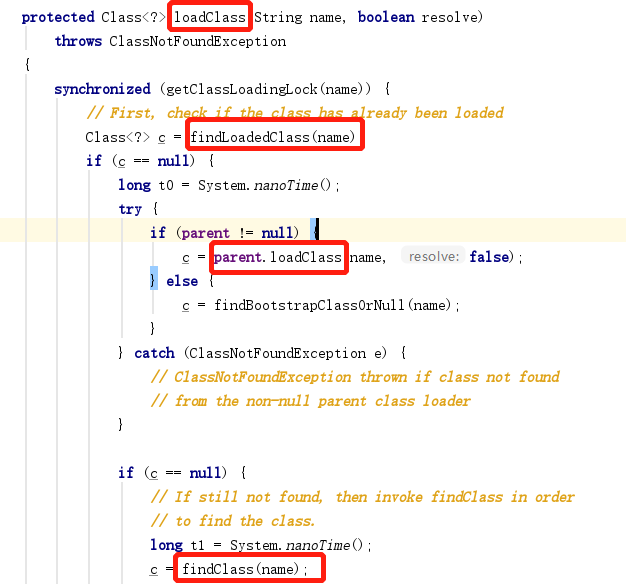 当前类加载器执行 loadClass ->findLoadedClass -> parent.loadClass -> findClass